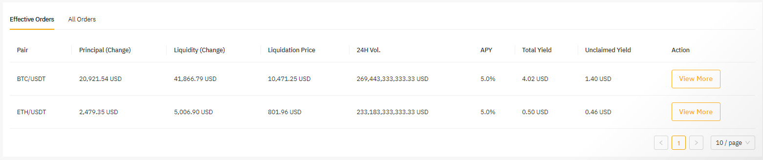 Ordens vigentes: Você pode visualizar os detalhes das ordens ativas, incluindo Par, Principal (Mudança), Liquidez (Mudança), Preço de Liquidação, APY, Rendimento Total, Rendimento Não Reivindicado e muito mais.