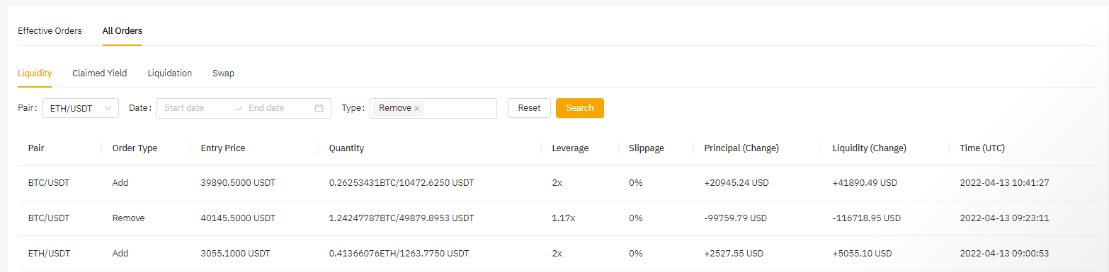 Por favor, vá para a Mineração de Liquidez na sua Conta de Ganhos em Ativos.De lá, você pode ver as abas Ordens vigentes e Todas as ordens.