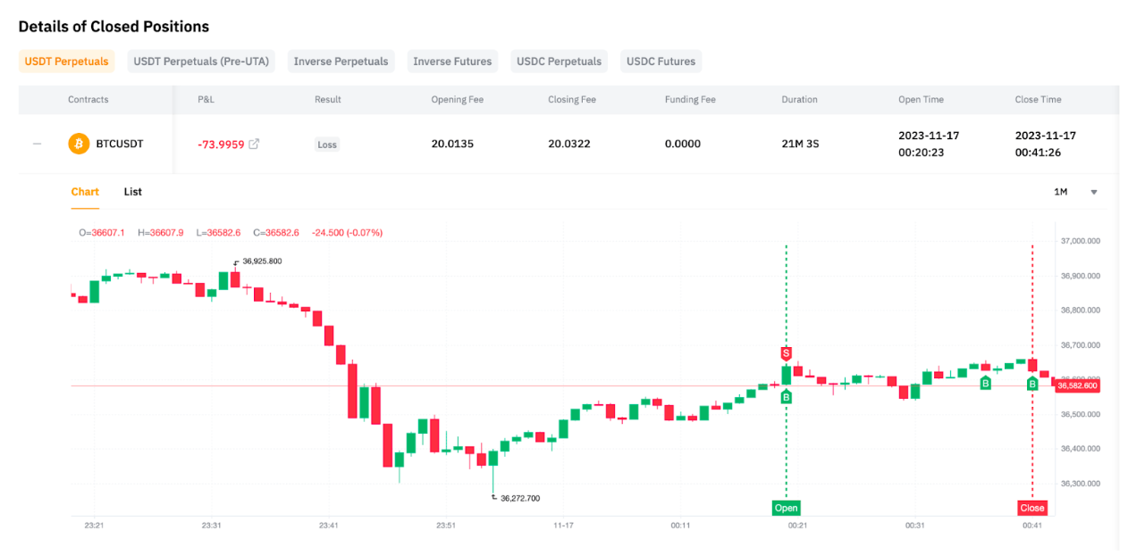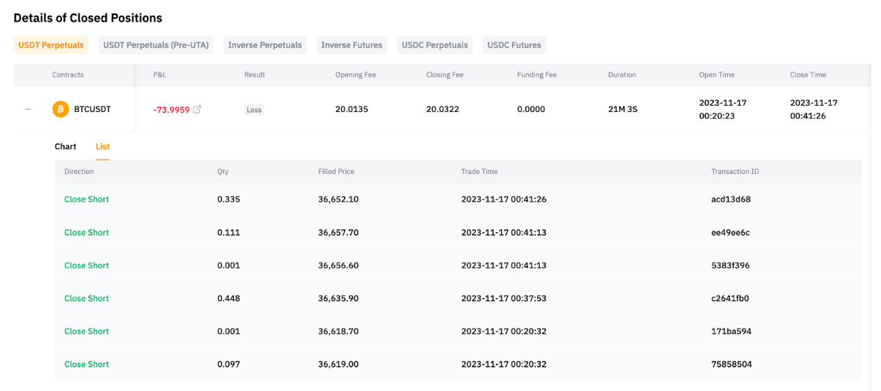In the List tab, you can access all trades associated with the position. This tab exclusively displays fully closed positions. For order details related to partially closed positions, you can refer to Details of Closed Orders under Trading Performance.