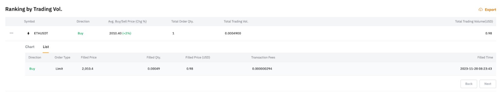 In the Ranking by Trading Vol tab, you can expand each symbol to view the Chart that shows your buy and sell points within the selected timeframe. Additionally, you can also select the time interval of the chart in the upper right corner and adjust the chart size.
