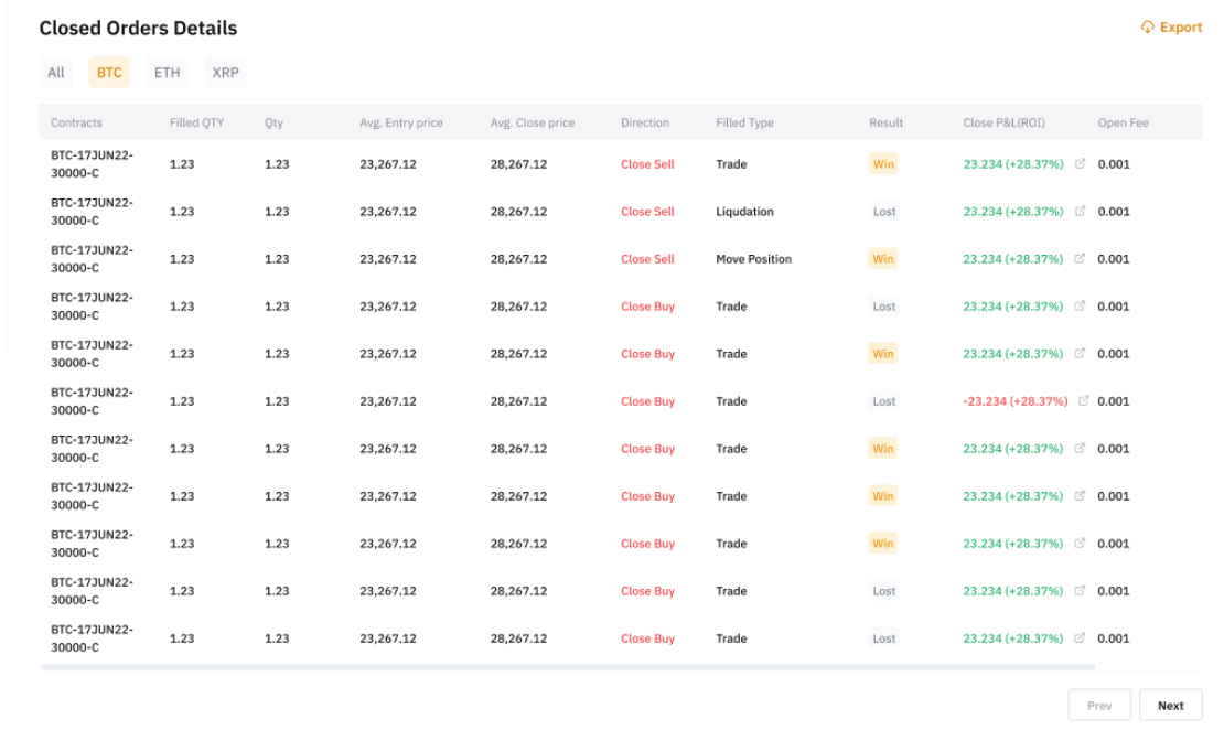 This shows the Closed P&L of all closed orders. Closed P&L = Position P&L - Opening Fee - Closing Fee - Funding Fee |