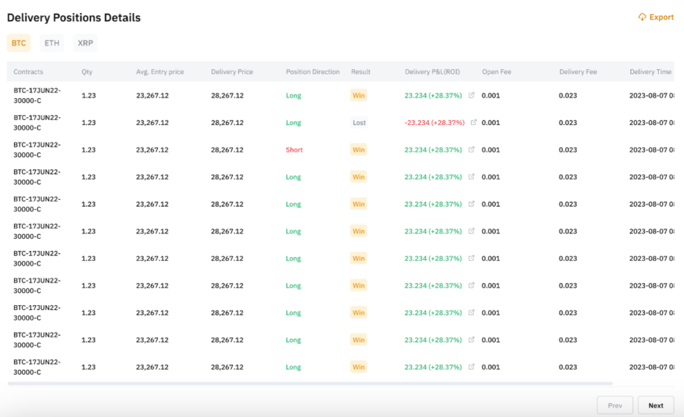 In the Details of Delivery Positions tab, you can select All to view all delivery positions. Alternatively, you can access comprehensive position details for specific contracts, including contract name, quantity, average entry price, delivery price, realized price, and more.