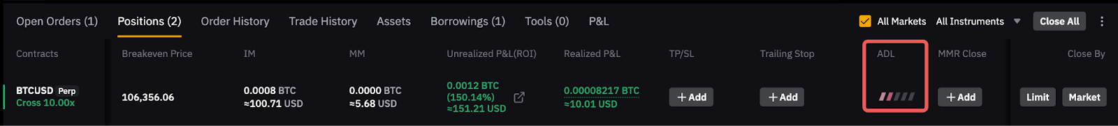 Traders can check the ADL ranking of each position from their Positions tab.