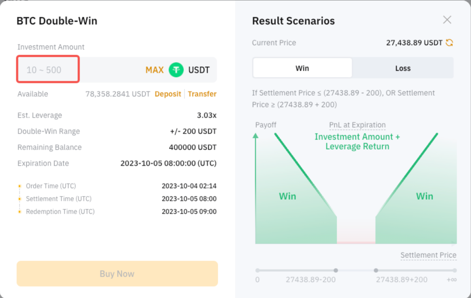 Double-Win is a short-term structured product designed to capitalize on significant market movements. Users can benefit as long as the settlement price falls outside the Double-Win range in both directions from the current price. However, if the settlement price falls within the Double-Win range, the investment amount will be lost.