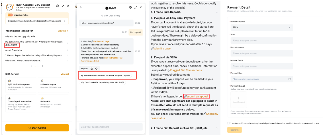 For users who deposit EUR via SEPA, you can submit an appeal on the payment details page by entering the Live chat window → Locate or enter an inquiry about Fiat Deposit → Click on Submit an Appeal to expedite the processing time.