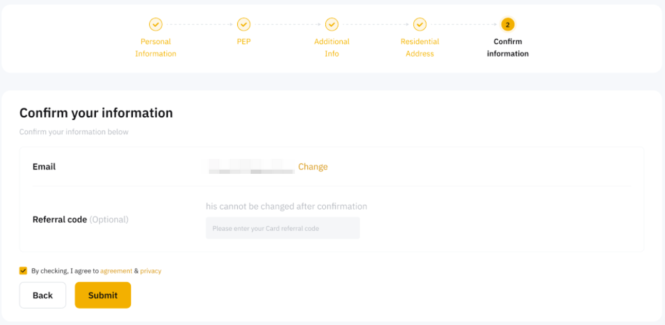 Step 6: Confirm (or set up) your registered email address, and add your referral code(if applicable), Then click on Next to proceed with the submission.