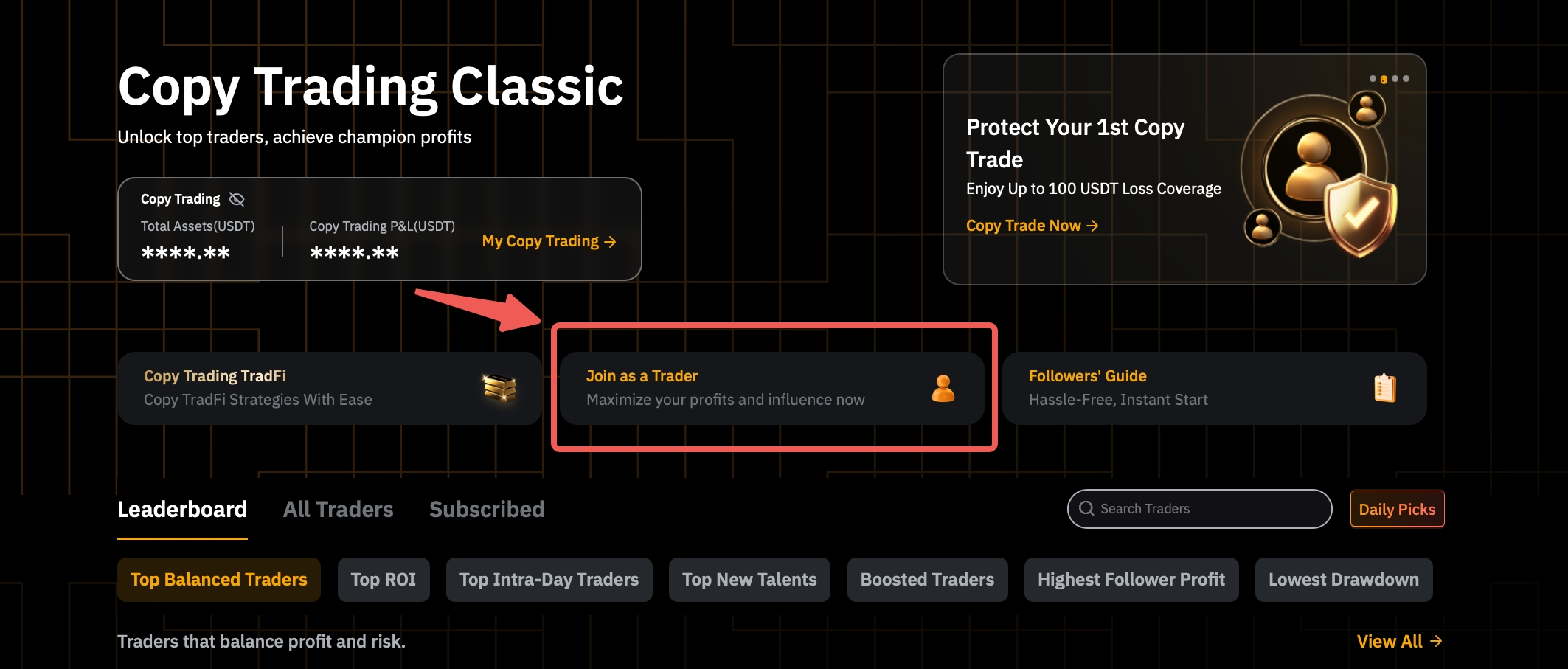 • Transfer to Master Trader Account: Transfer a minimum of 100 USDT from any account within your Main Account to this Master Trader Account