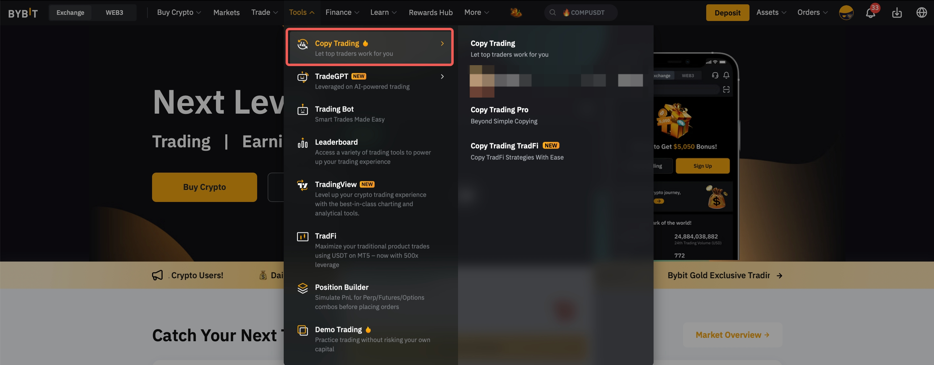 Step 2: Please click on Tools Copy Trading in the navigation bar to enter the Discover Top Traders page.