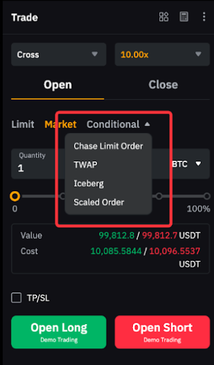 A TP/SL order allows you to set a target price to trigger a close order to secure profits or limit losses. For more details, refer to Introduction to Take Profit and Stop Loss (Perpetual and Futures Contracts).