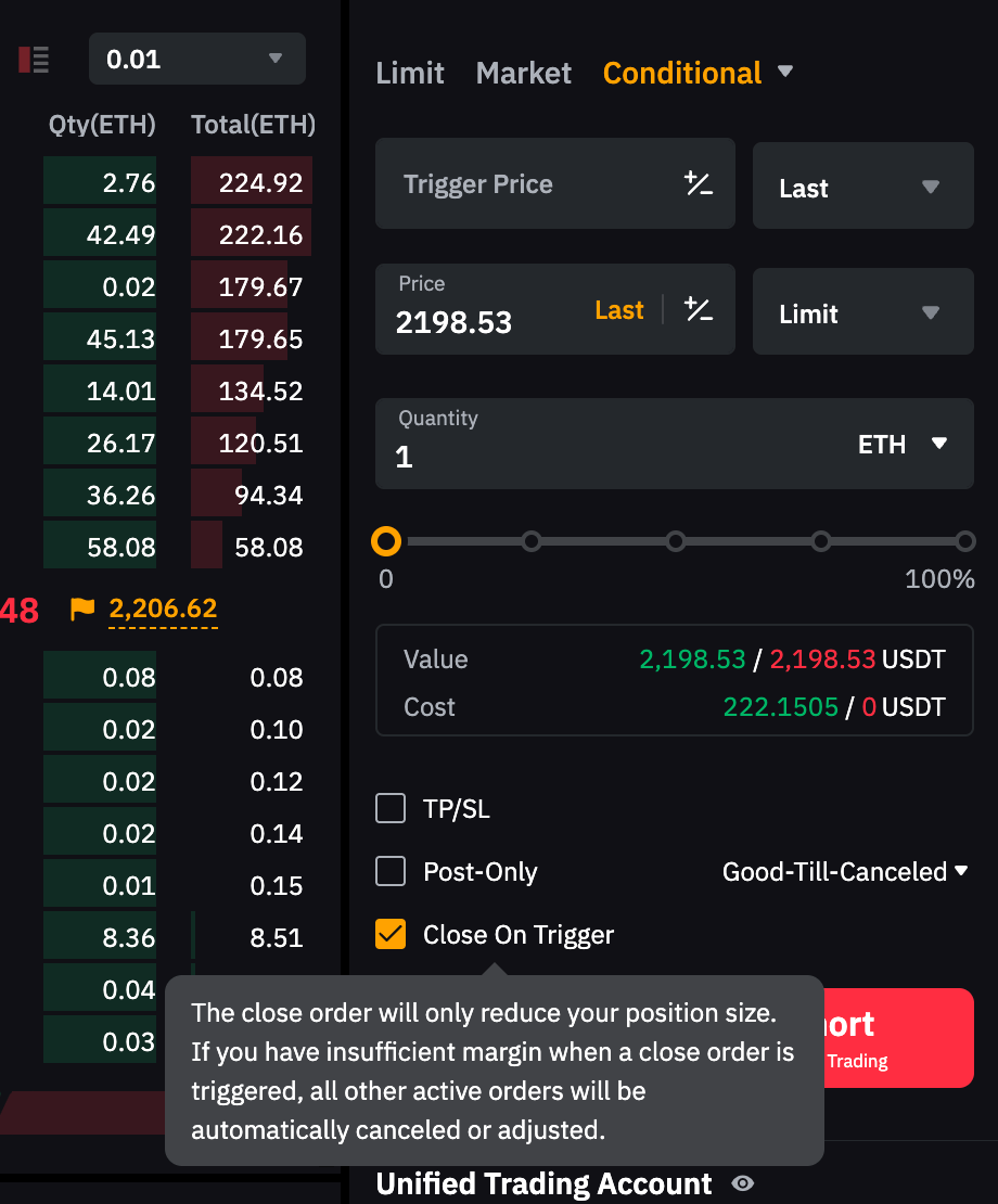 Note: If the order quantity exceeds your current position size, a new position in the opposite direction may be opened. To avoid this, you can enable Reduce Only for a limit order or Close on Trigger for a conditional order.