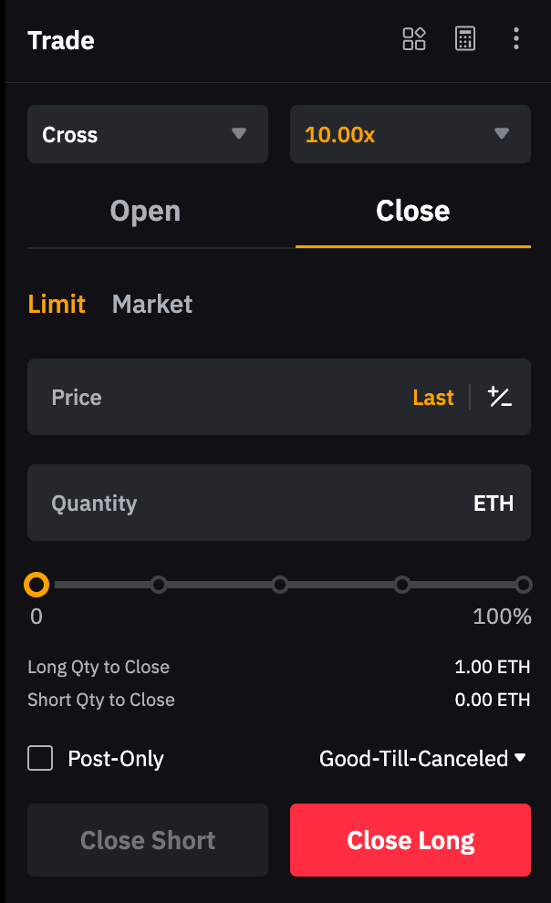 For example, to close a 1 BTC long position, place a 1 BTC short market order. Please note that if the order quantity exceeds your current position size, a new position in the opposite direction may be opened.
