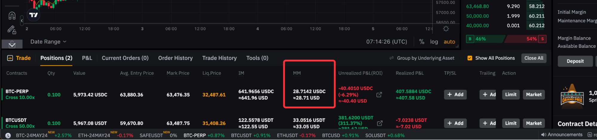 In this case, the total maintenance margin displayed on the position tab will be 11,242 USDC (11,000 USDC + 242 USDC).