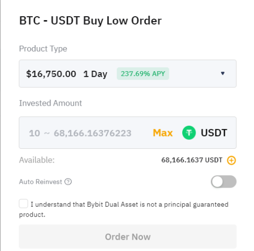 El APR está garantizado. Sin embargo, el rendimiento del valor de los activos no está garantizado, debido a la volatilidad del mercado. En la Fecha de Liquidación, recibirá su rentabilidad en stablecoins (USDT) o en el tipo de criptoactivo suscrito, dependiendo de si el Precio de Liquidación alcanza el Precio Objetivo.