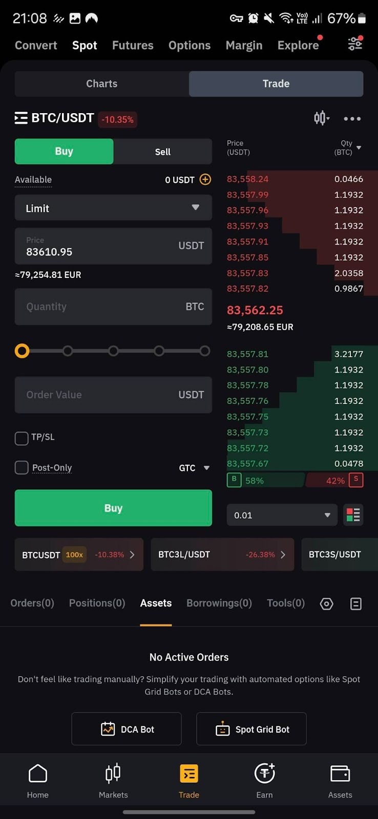 Las órdenes de compra y venta de mercado se completarán al mejor precio disponible en el libro de órdenes. Es más preciso para los traders que ingresen la cantidad de activos (token de base o de cita) que quieren usar para comprar o vender criptomonedas en lugar de la cantidad a comprar.