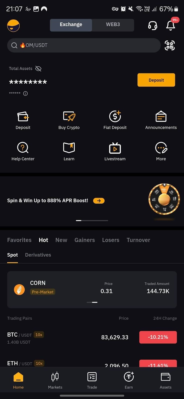 - Depósito: Si tu cuenta actualmente no tiene criptoactivos, puedes realizar un depósito directo de fondos.