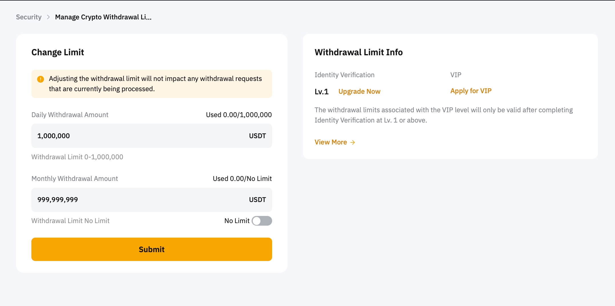 — Pengguna VIP berhak mendapat batas penarikan yang lebih tinggi, yang akan ditetapkan secara default pada 1 juta untuk KYC Standard dan 2 juta untuk KYC Lanjutan pada pengaturan Akun & Keamanan. Jika Anda ingin meningkatkan batas penarikan, Anda harus mengatur secara manual jumlah batas penarikan sesuai pedoman di bawah.