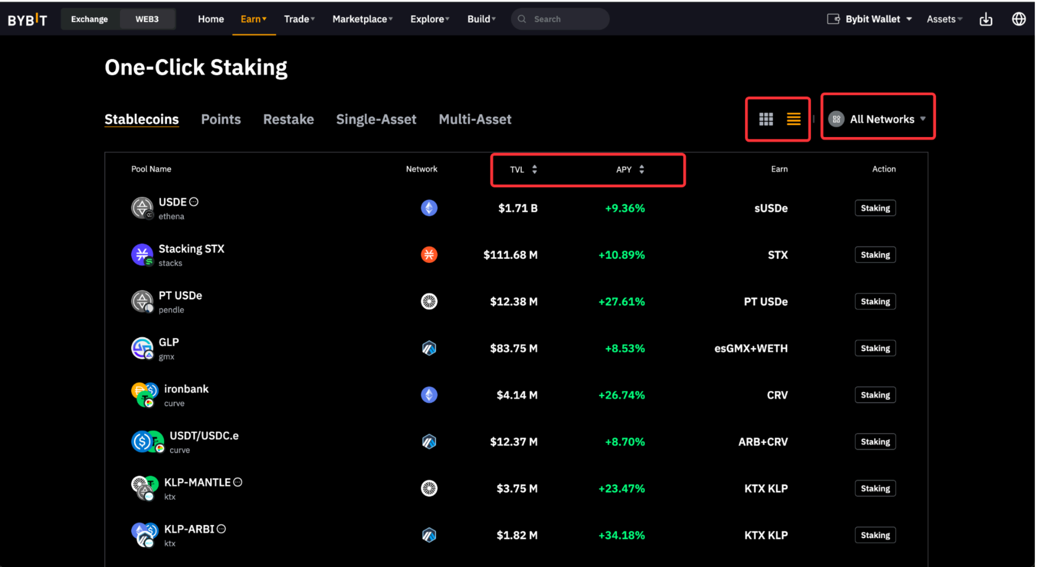 Langkah 1: Pada halaman Staking, Anda dapat melihat semua kumpulan staking yang tersedia. Klik ikon grid atau daftar untuk menyesuaikan tampilan. Anda dapat mengatur pool sesuai dengan APR atau TVL, atau mengeklik Semua Jaringan, dan melihat pool staking berdasarkan jaringan.