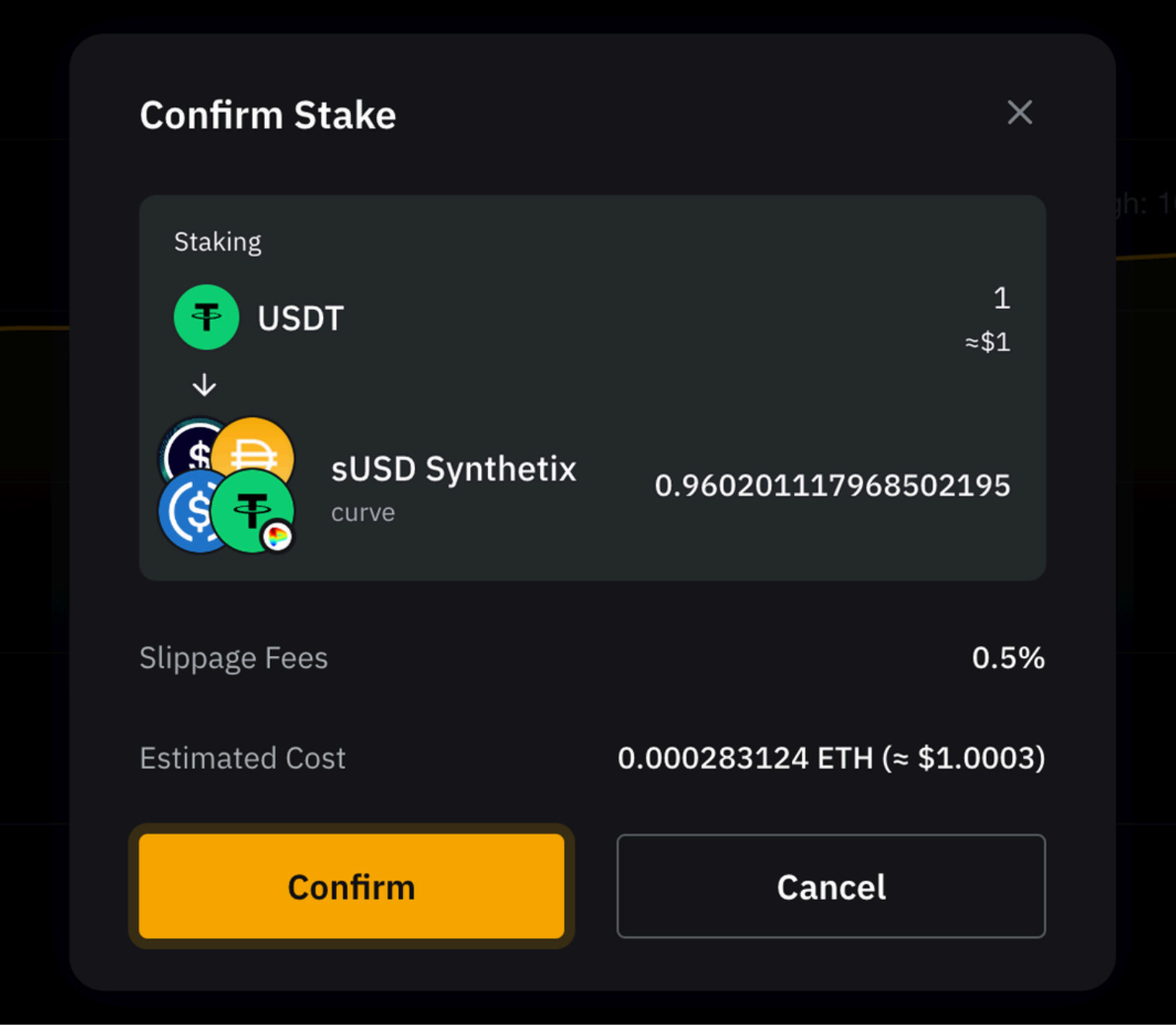 Langkah 2: Di jendela pop-up, verifikasi detail pesanan staking Anda. Catat selip dan perkiraan biaya, dan klik Konfirmasi.