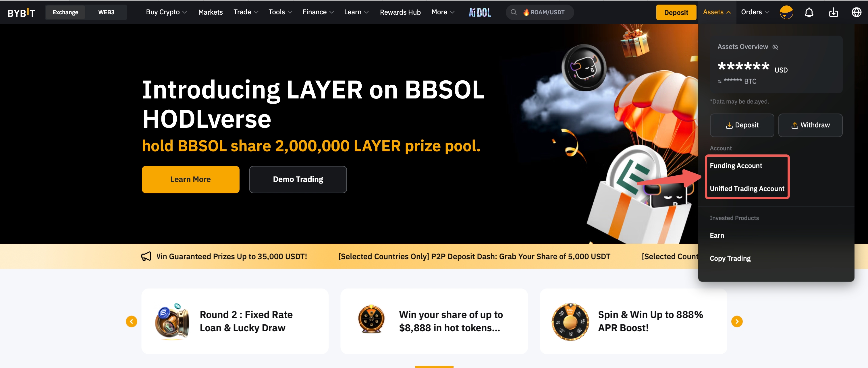 Langkah 1: Klik Aset di sudut kanan atas laman beranda Bybit dan pilih akun tempat dana Anda berada.