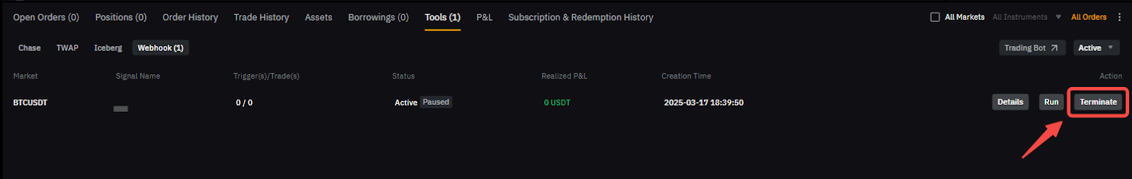 Penghentian atau Jeda Manual: Untuk menghentikan sinyal webhook secara manual, navigasikan ke Tab Alat. Temukan sinyal yang diinisiasi oleh webhook yang ingin Anda tutup dan klik Hentikan. Jika Anda ingin menghentikan strategi untuk sementara waktu, klik Jeda.