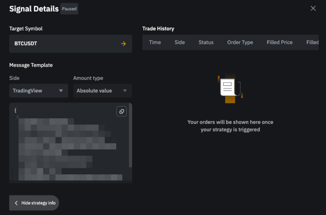 Untuk melihat Detail Sinyal Anda selengkapnya, klik tombol Detail di samping dan Anda dapat meninjau URL Webhook dan Templat Pesan Anda. Selain itu, Anda juga akan dapat melihat perdagangan yang dieksekusi melalui strategi ini.