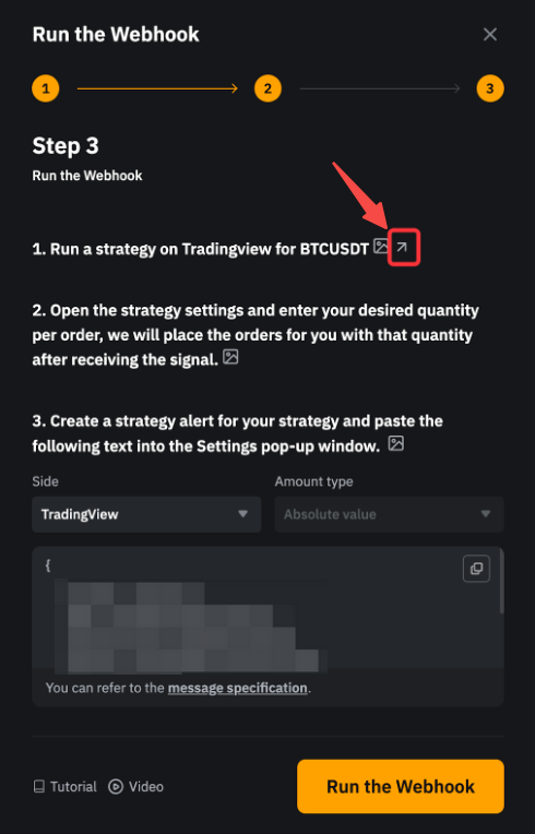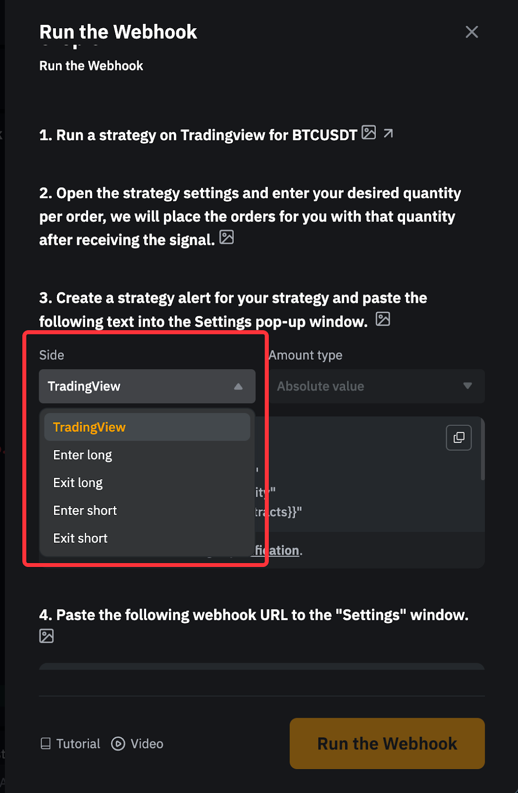 • Anda dapat memilih jenis Jumlah dari laman pengaturan Webhook atau mengedit nilai parameter secara langsung dari templat yang ditempel di Tradingview.