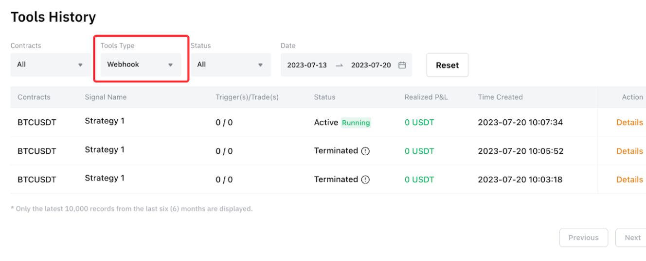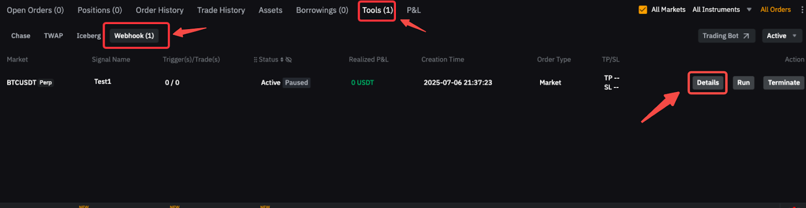 Untuk melihat detail spesifik Sinyal Webhook, silakan buka tab Alat, lalu pilih Webhook. Di sini, Anda dapat melihat Nama Sinyal, Waktu Terpicu / TradeTime, L&R Terealisasi, dan Waktu Dibuat.
