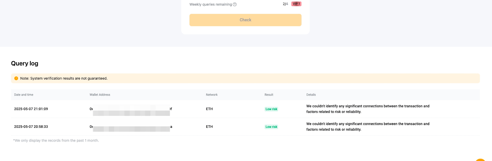 Fitur ini hanya tersedia untuk pengguna VIP. Setiap level VIP diberikan sejumlah pertanyaan penilaian risiko per minggu dan kuota pertanyaan direset setiap Minggu pukul 00.00 (tengah malam) UTC. Anda dapat meningkatkan level VIP untuk mendapatkan permintaan pemeriksaan (kueri) yang lebih sering.