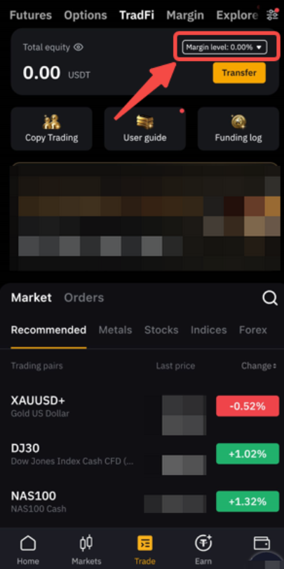 Tingkat Margin untuk TradFi (MT5) dalam aplikasi seluler Bybit dapat ditemukan pada tab Trades di bawah ini.