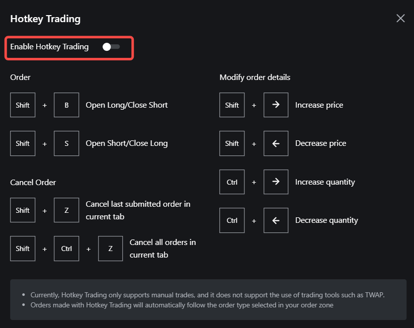 | ホットキー取引を使用すると、キーボードのショートカットを使用してすばやく取引を行うことができます。現在、ホットキー取引は手動の成行、指値、条件付き取引のみに対応しており、お客様の注文ゾーンで選択した注文タイプに従います。 |