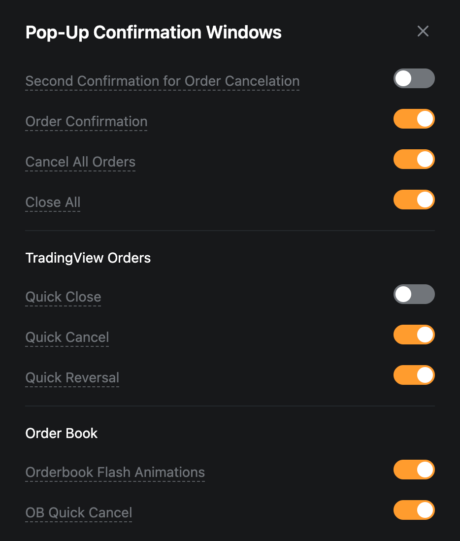 Bybitでは、間違った操作を避けるため、少なくとも注文確認、クイックリバース、すべての注文決済、すべての注文キャンセルの確認ウィンドウを有効にすることを強く推奨しています。 |
