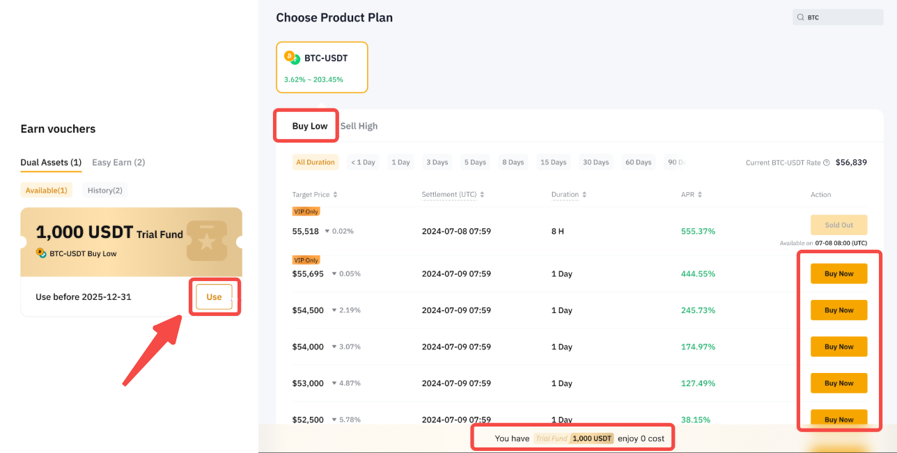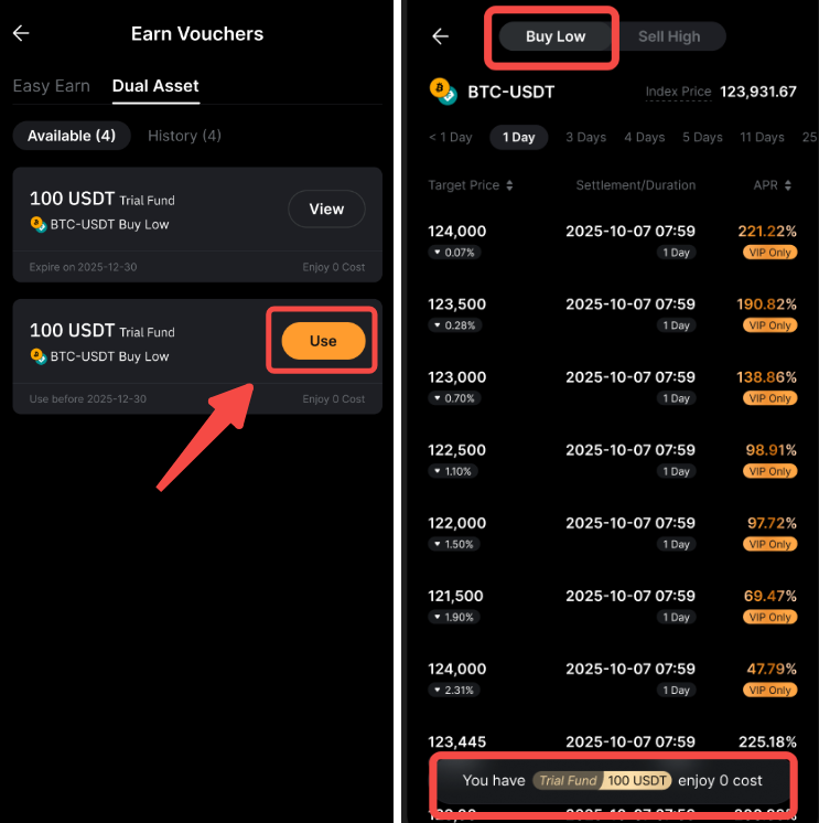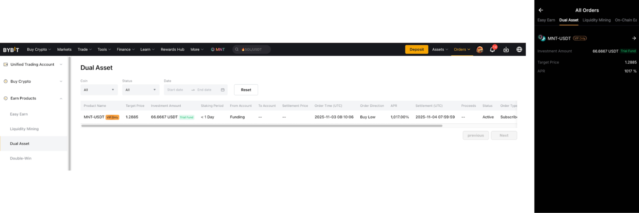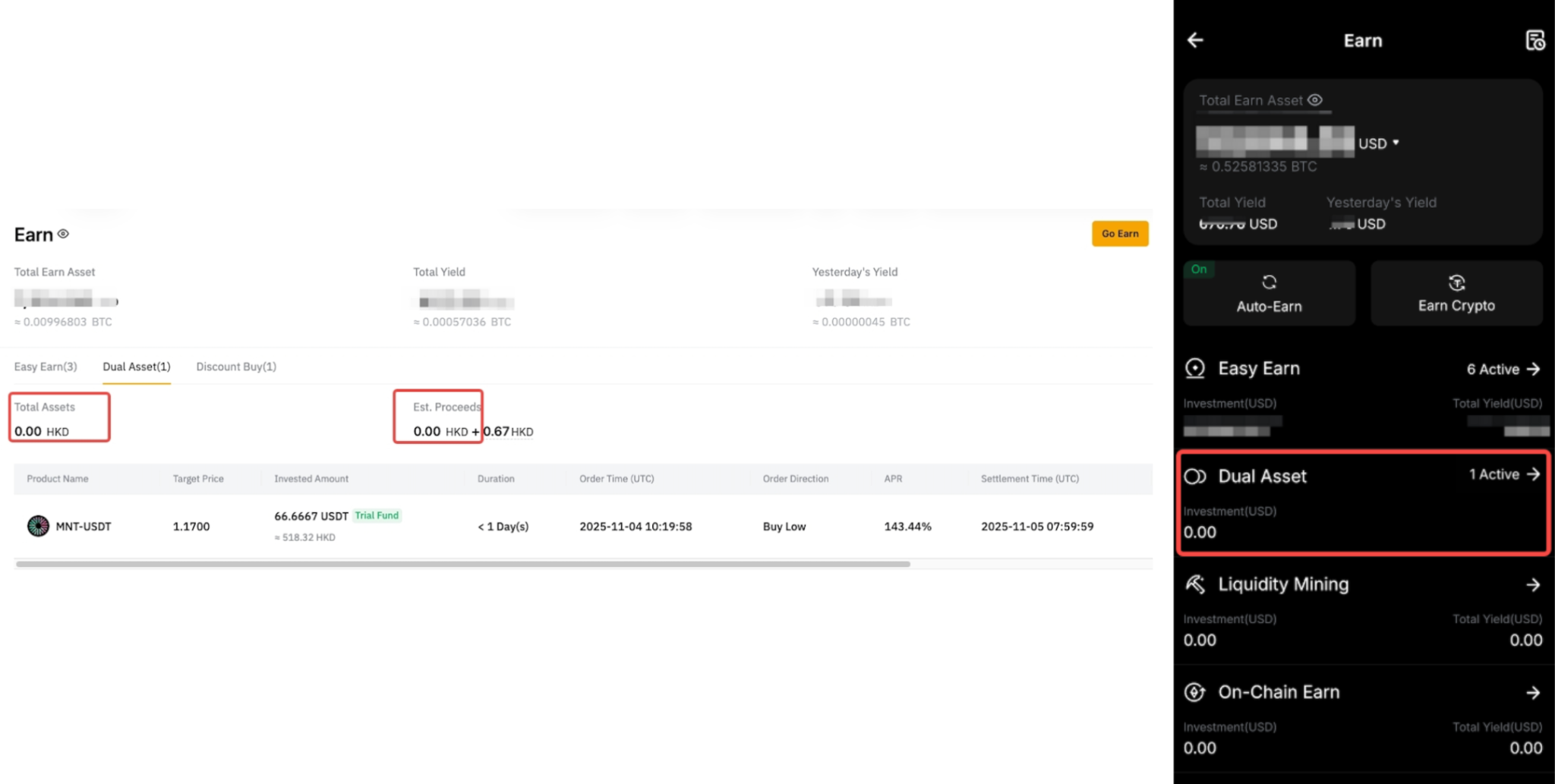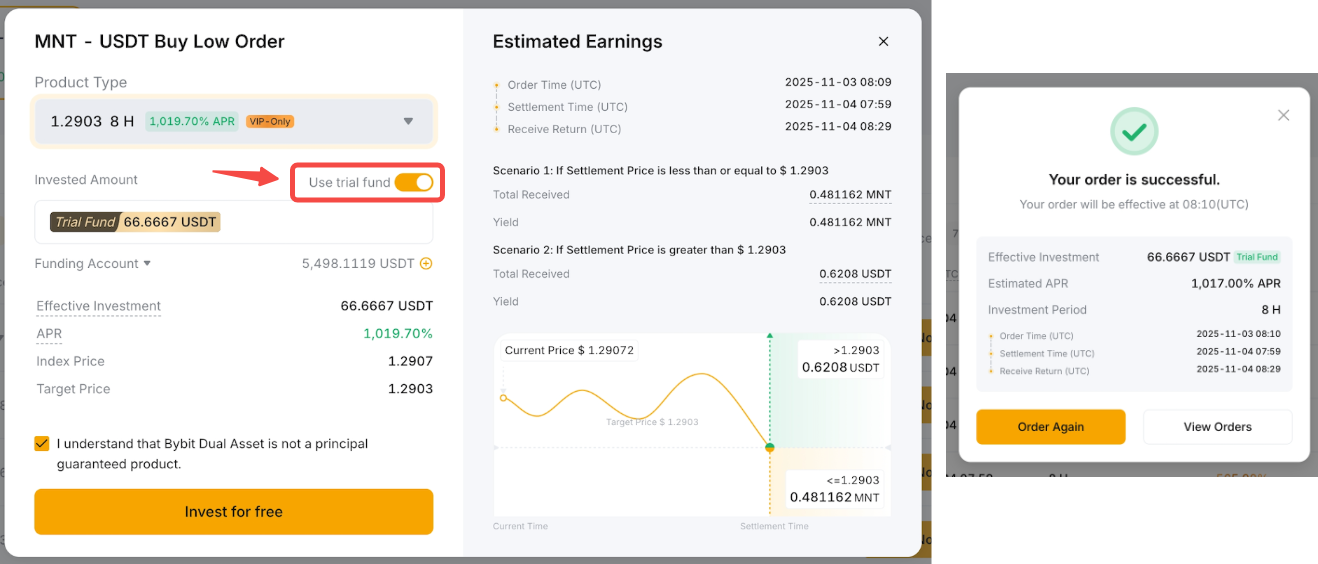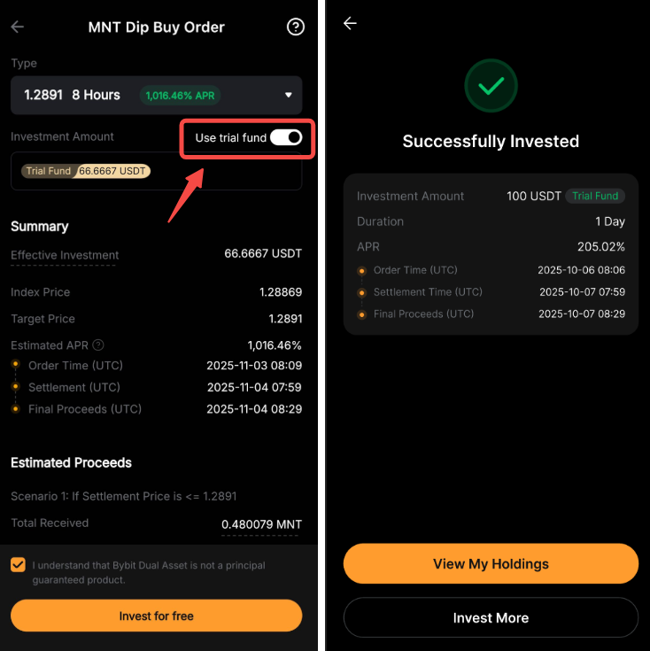 O fundo de teste de Investimento Duplo permite que você experimente retornos reais de Investimento Duplo sem incorrer em nenhum custo. Seus ganhos são determinados pelo preço de liquidação e APR do produto. Embora o rendimento seja adicionado à sua conta, o principal do fundo de teste não será contado para o total de seus ativos.