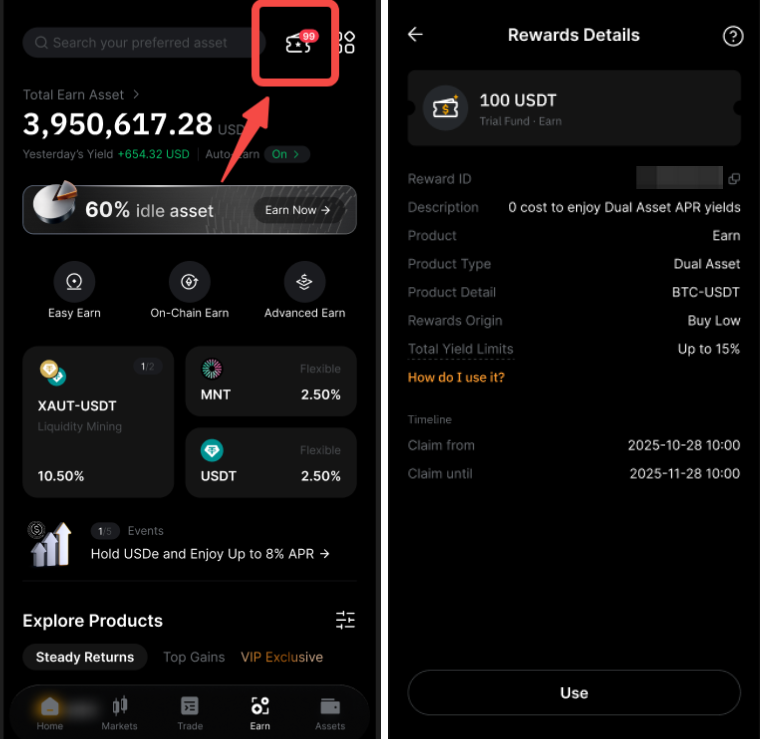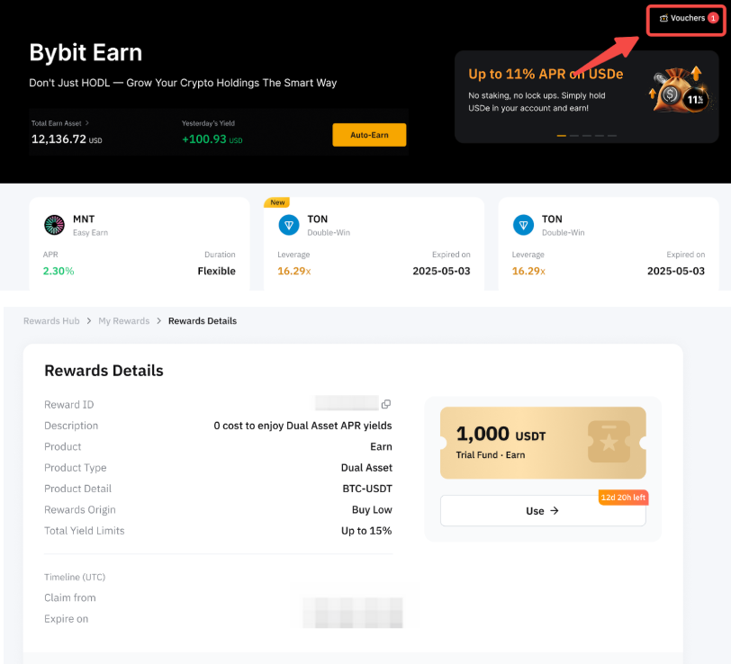 Se você for elegível para um Fundo de Teste para o produto Investimento Duplo, encontrará os prêmios na página Bybit Earn em Voucher, localizada no canto superior direito. Como alternativa, você também pode encontrar essas recompensas do Fundo de Teste na página Minhas Recompensas.