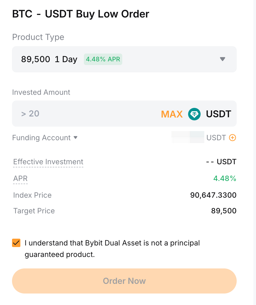 Os retornos no valor do ativo não são garantidos, devido à volatilidade do mercado e à tolerância de slippage de até 5%. Na data de liquidação, você receberá seus retornos em stablecoins (USDT) ou no tipo de criptoativo selecionado na inscrição, dependendo do preço de liquidação ter ou não atingido o preço alvo.