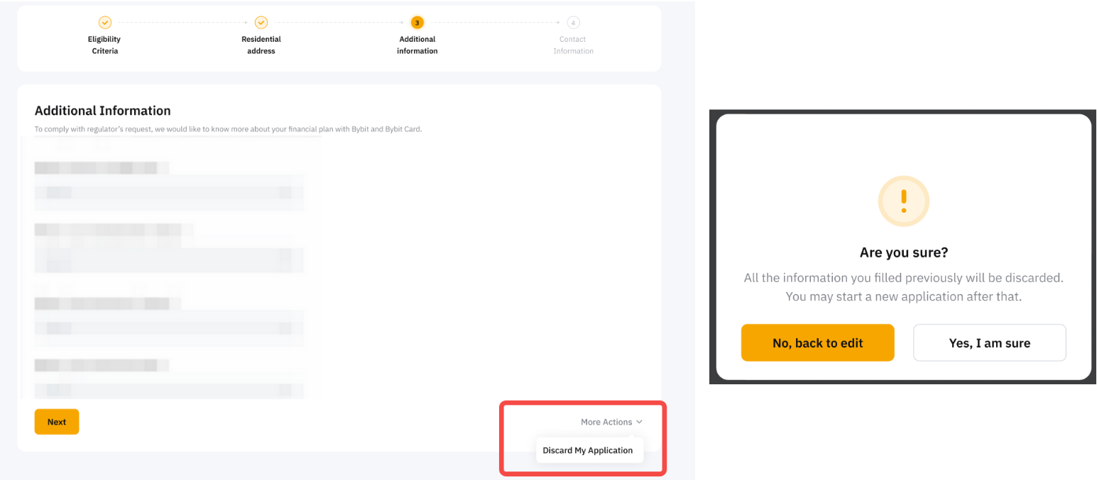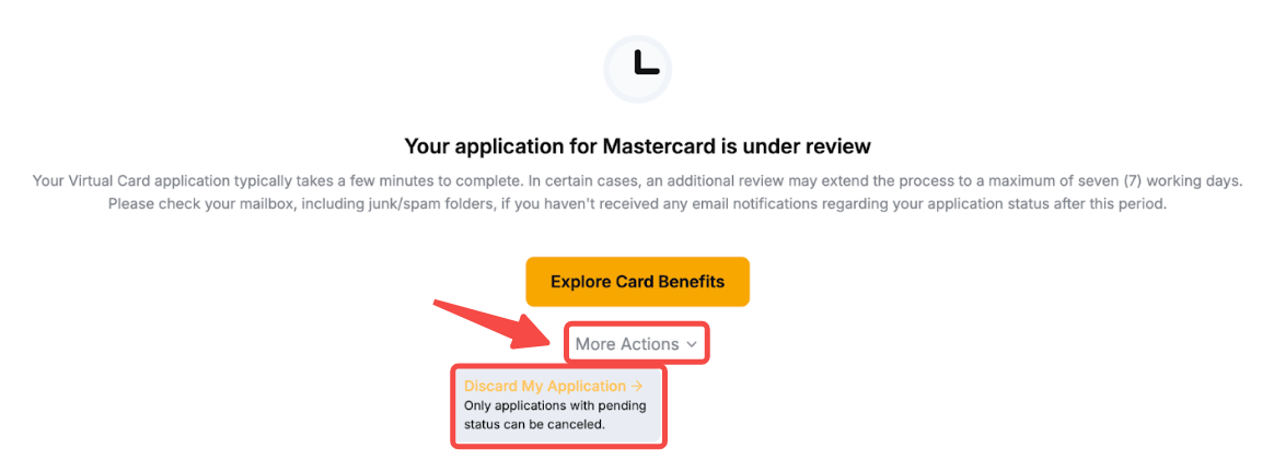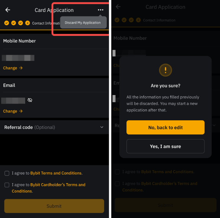 Você pode cancelar sua aplicação para o Cartão Bybit clicando em Visualizar minha aplicação → Mais ações e selecionando Descartar minha aplicação de cartão.