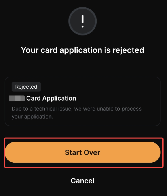 - Se a sua solicitação de cartão foi rejeitada após o envio, você sempre pode Recomeçar com uma nova solicitação.