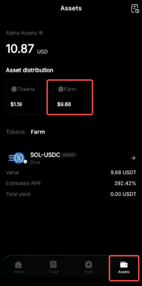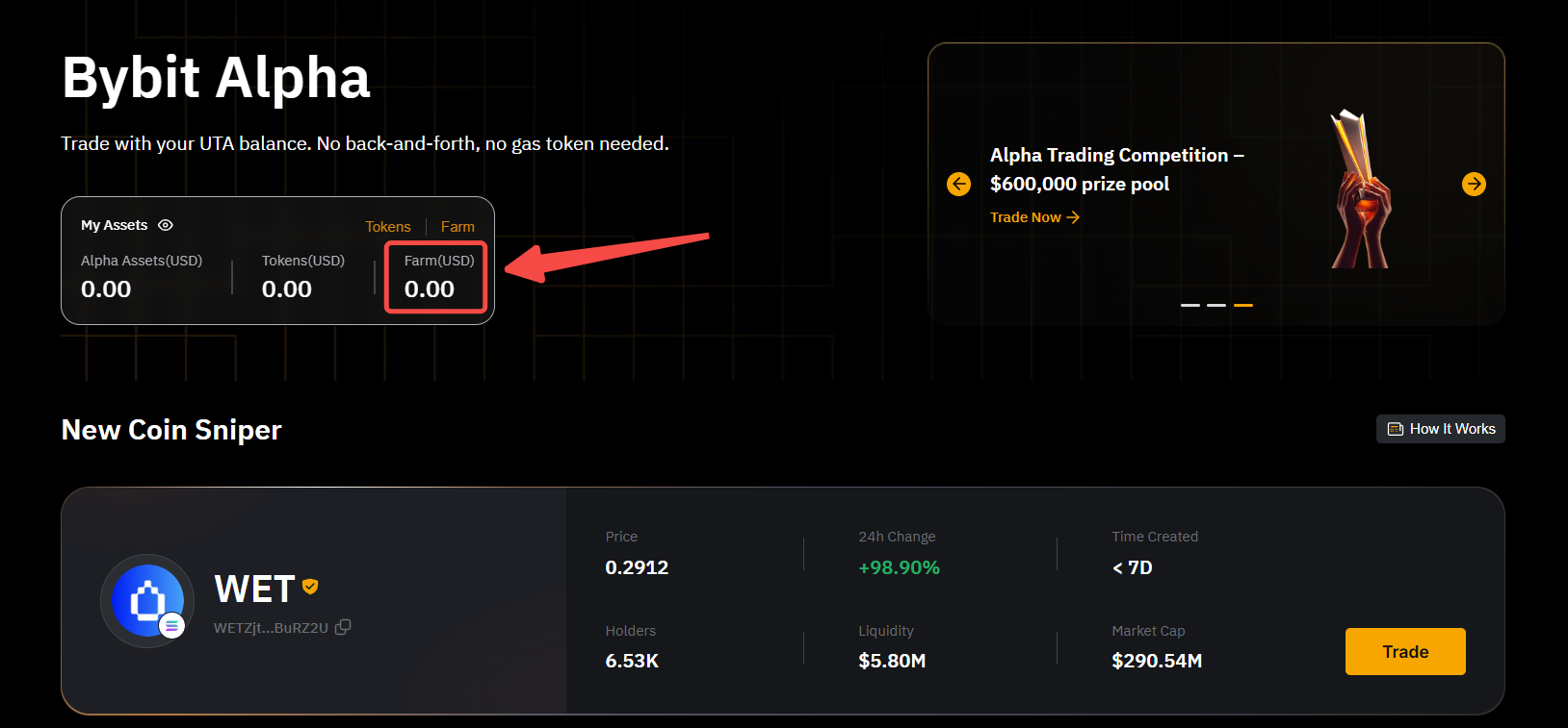 Se você estiver usando o app da Bybit, acesse a página inicial do Bybit Alpha → Ativos → Farm.