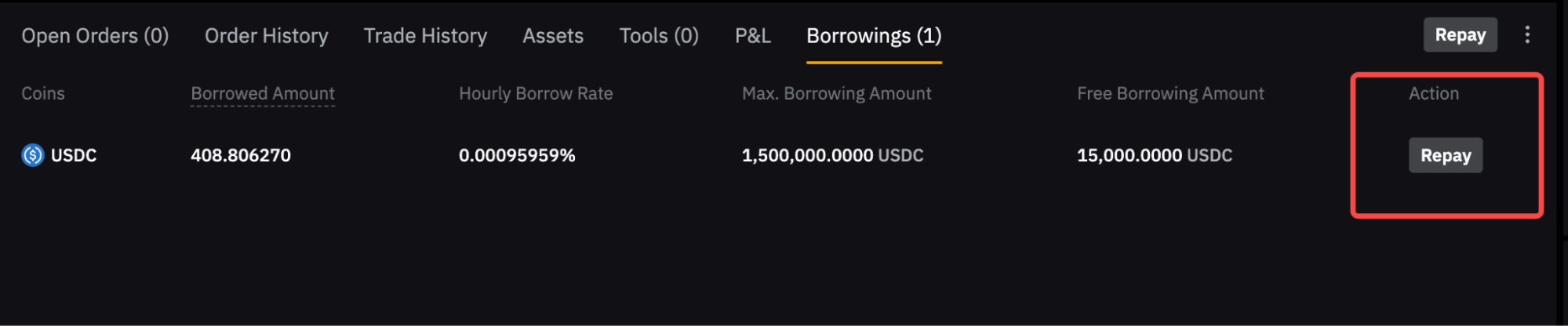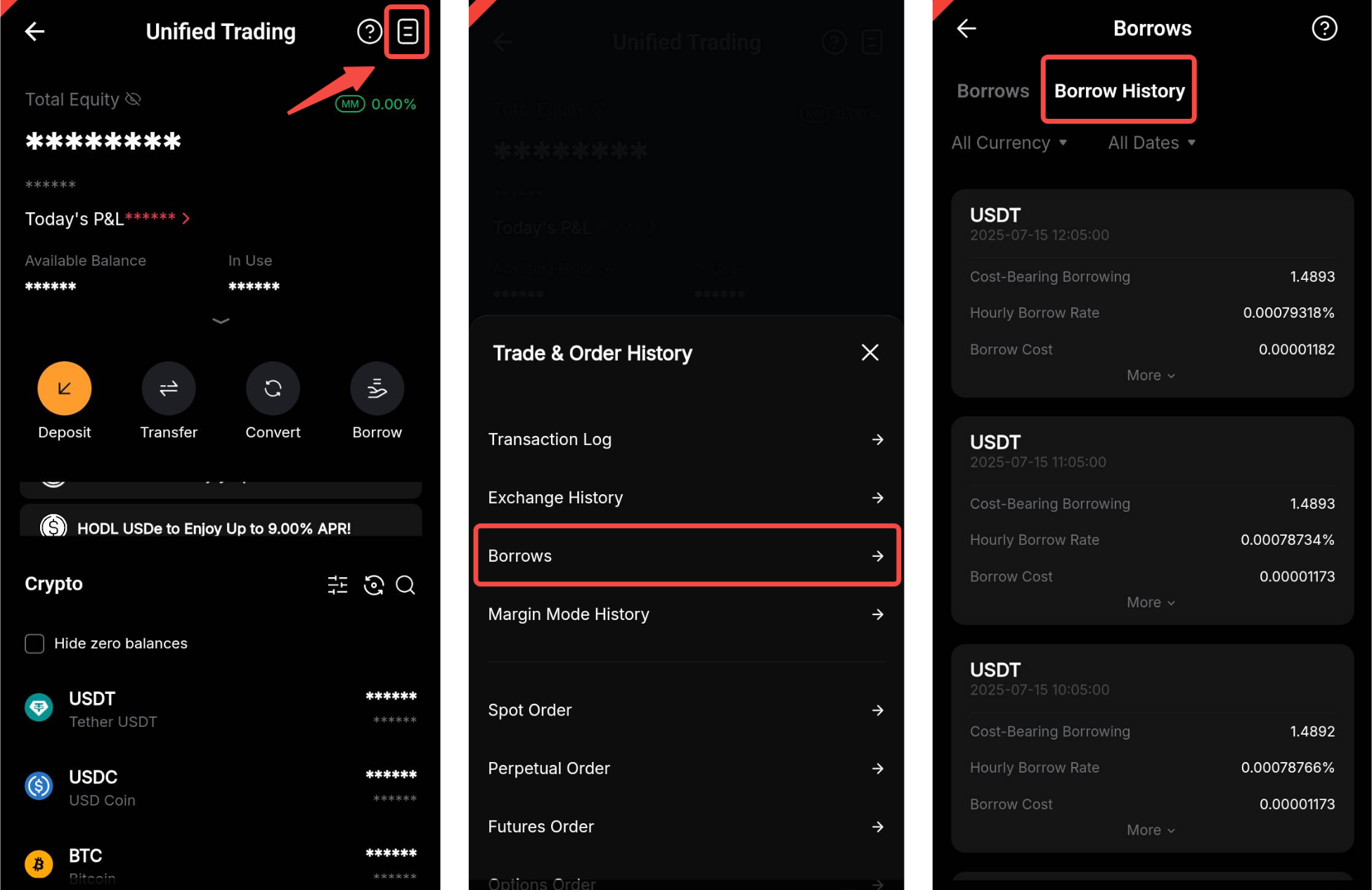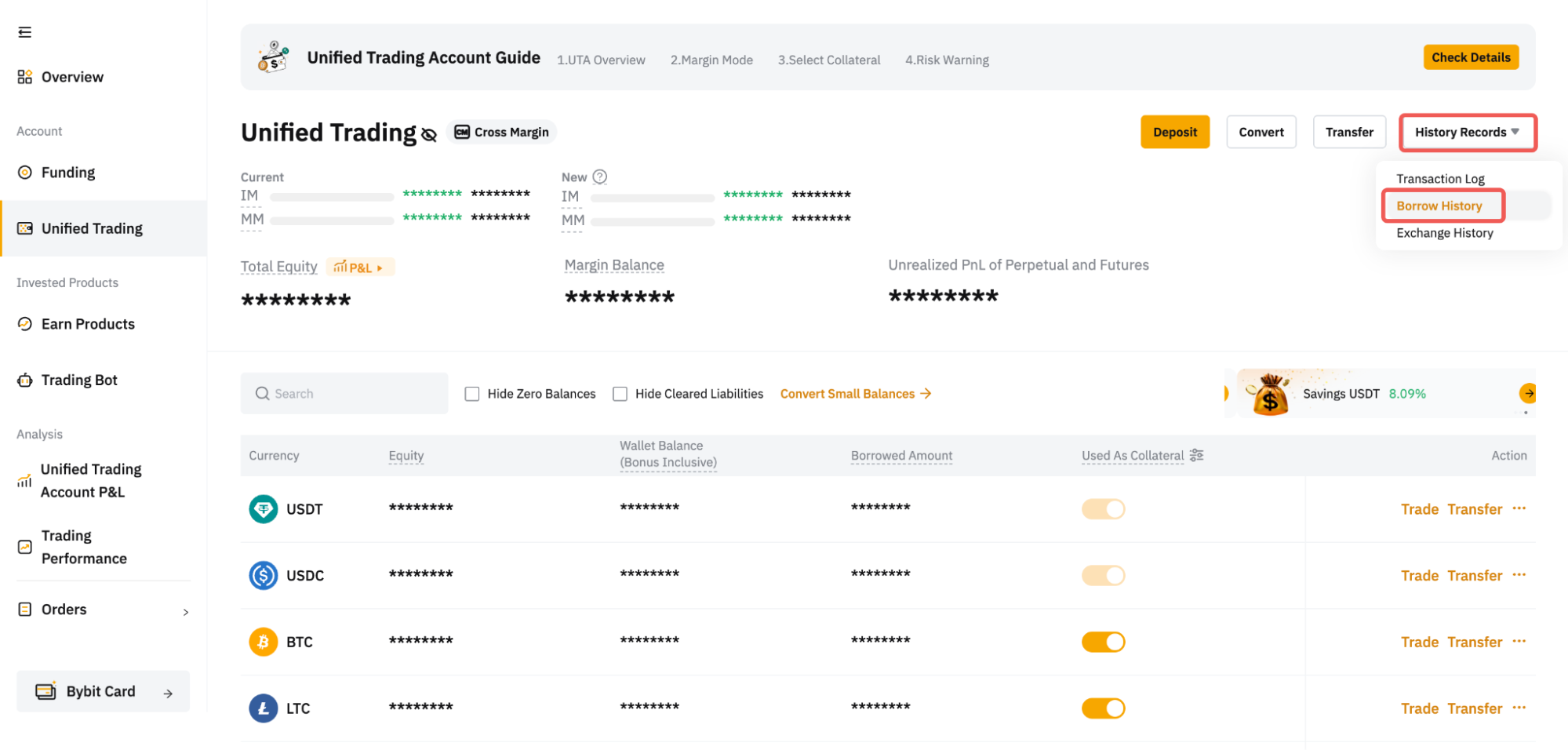 Você pode ver seu Histórico de empréstimos na página de ativos da Conta de Trading Unificado