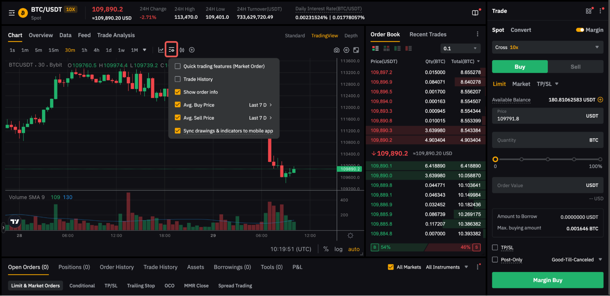 Para acessar o Spot Margin Trading na Web e no aplicativo, basta acessar a página de Trading em Spot e ativar a opção Margem. Uma vez ativado, você poderá ajustar a alavancagem desejada na coluna disponível. Para mais detalhes, consulte Como começar no Trading de margem da Bybit.