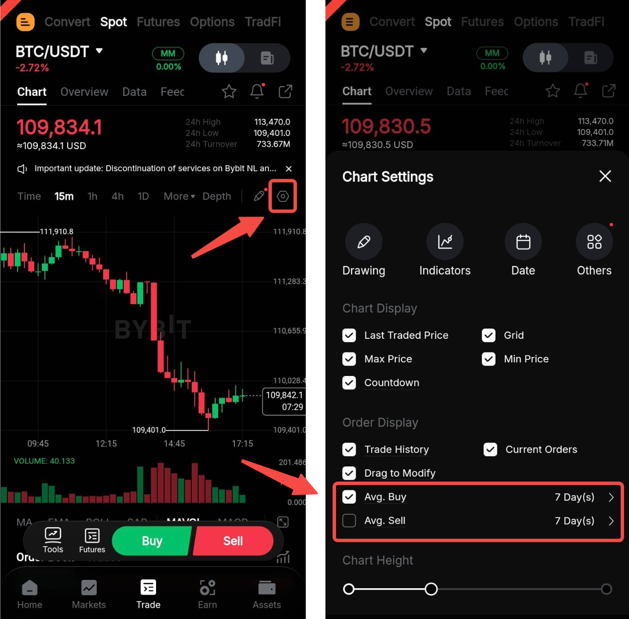 Ao fazer trading em Spot, você pode exibir o preço médio de suas ordens de compra e venda diretamente no gráfico de trading. Para habilitar, clique em Exibir e marque a opção de preço médio que você gostaria de ver. Você também pode selecionar o período de acordo com o qual a média será calculada. Observe que o cálculo é baseado em trades do dia atual até o último dia do período selecionado.