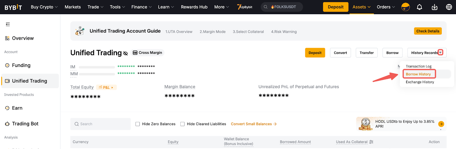 Или перейдите в раздел Единый торговый аккаунт → История → История займов. Там вы сможете увидеть свою почасовую процентную ставку и подробную информацию о вашем займе.
