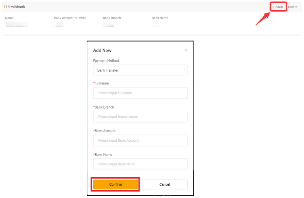 Clique no botão Atualizar. Na janela pop-up, faça as alterações necessárias em suas informações e clique em Confirmar.