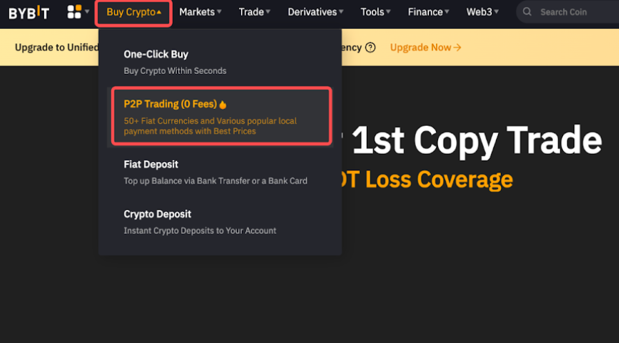 1o passo: Clique em Comprar cripto → Trading P2P no lado esquerdo da barra de navegação para entrar na página de trading P2P.