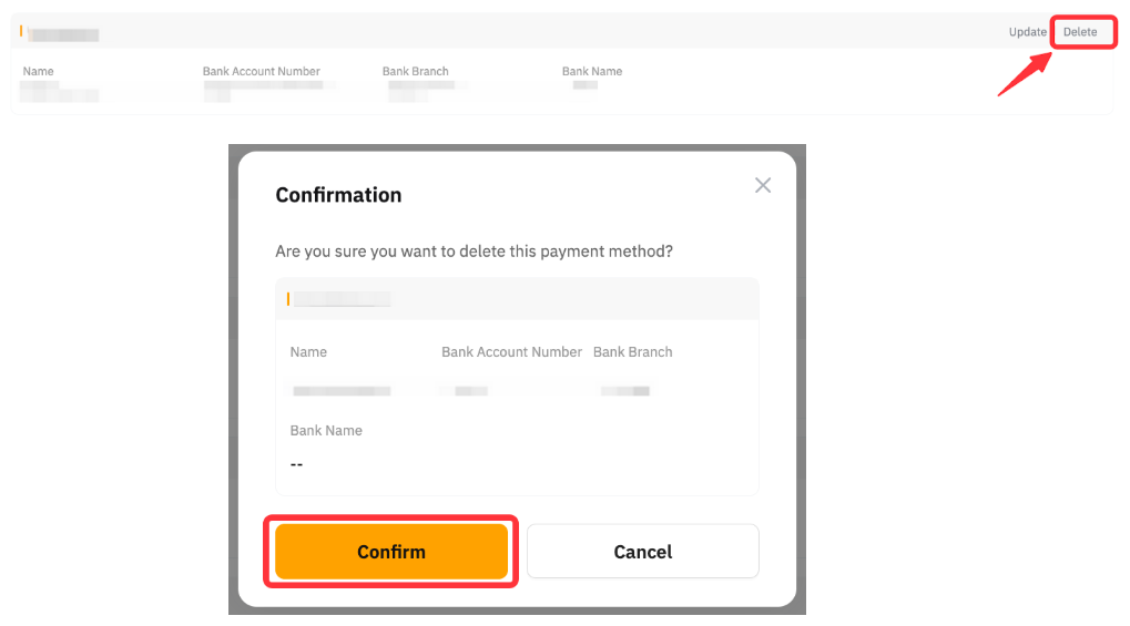 Clique no botão Excluir para remover a forma de pagamento. Certifique-se de excluir a forma de pagamento desejada e clique no botão Confirmar na janela pop-up.