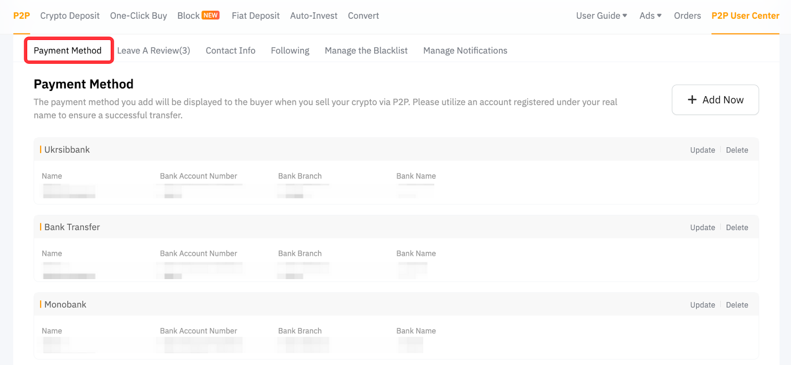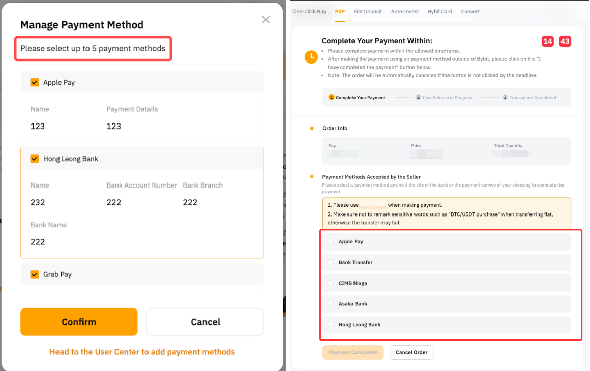 — Até 5 (cinco) métodos de pagamento serão exibidos para a contraparte. Você pode configurar o método de pagamento da sua preferência para aparecer em Método de pagamento na Central do Usuário P2P.