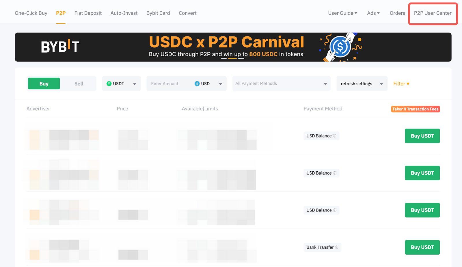 2o passo: Clique em Central do usuário P2P no canto superior direito para inserir seu perfil.