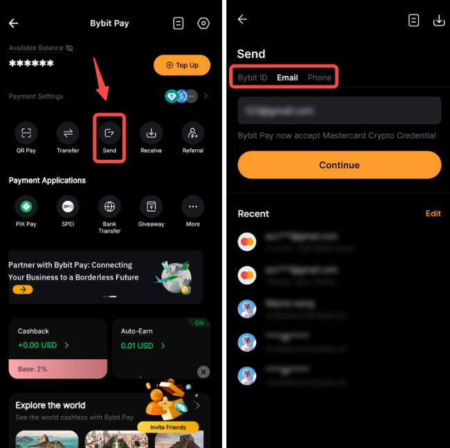 Passo 1: Toque em Enviar na página Bybit Pay e escolha enviar via ID Bybit, Email, ou Número de Telefone.