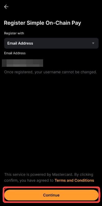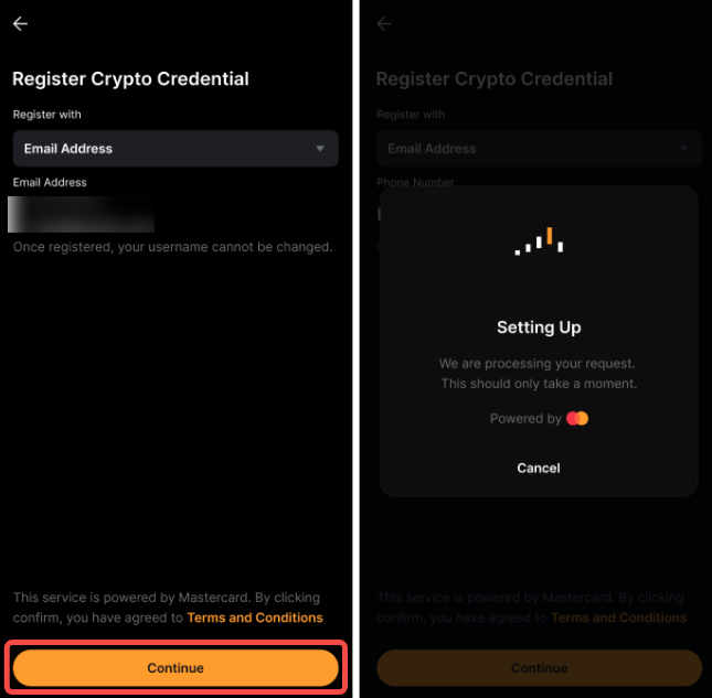 Passo 3: Selecione o Endereço de Email ou Celular Número, então toque em Continuar para salvá-lo como um Mastercard Crypto Credential.