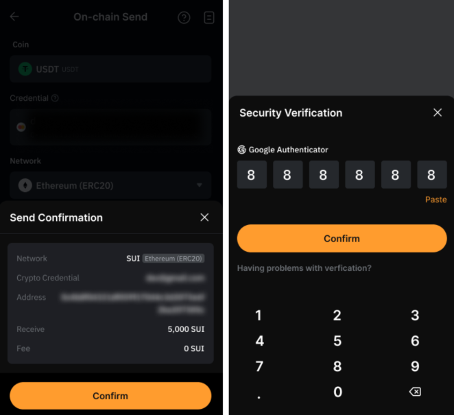 Passo 5: Revise os detalhes da sua transação antes de tocar em Confirmar e insira seu código do Google Authenticator para completar a solicitação.