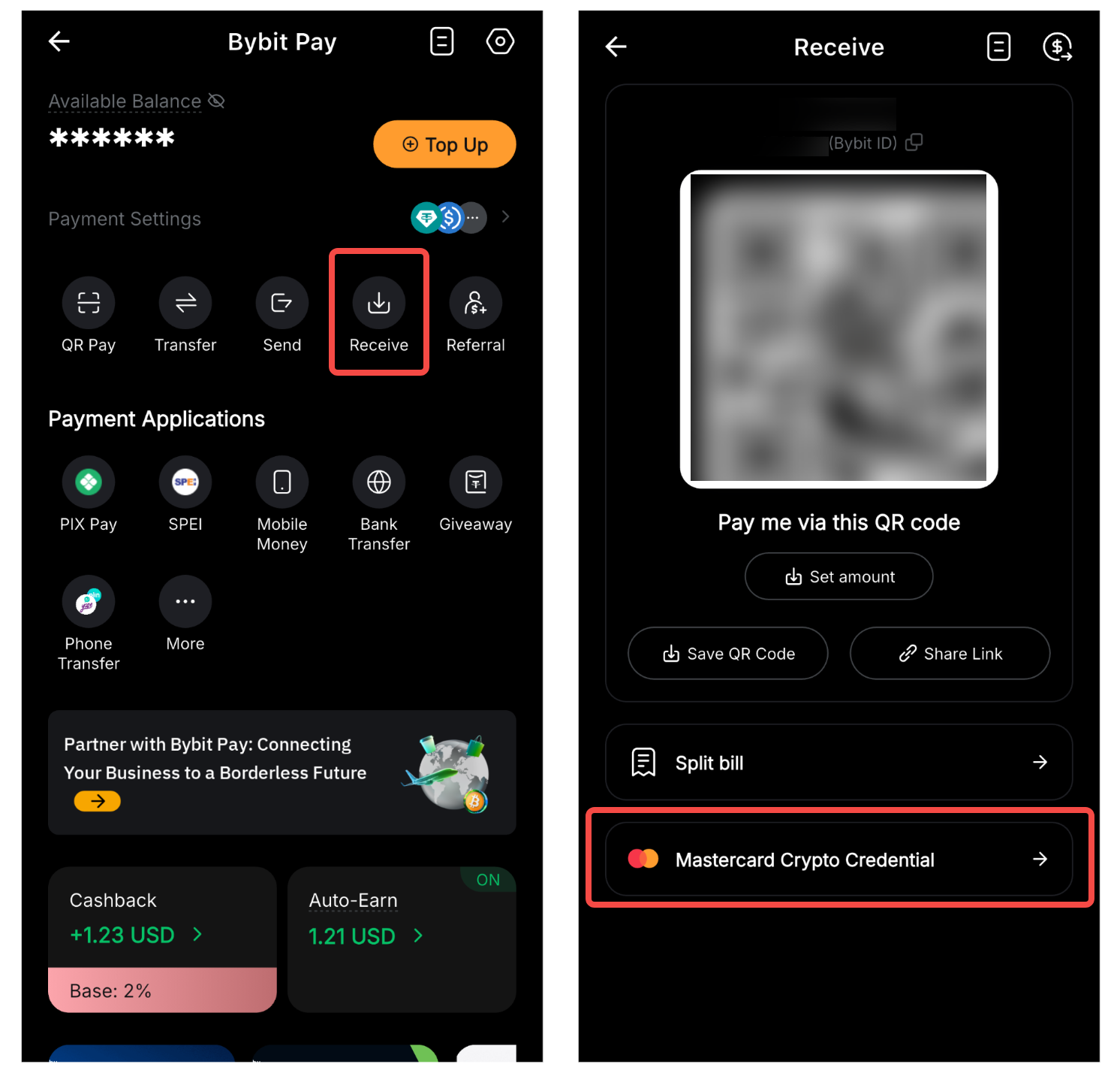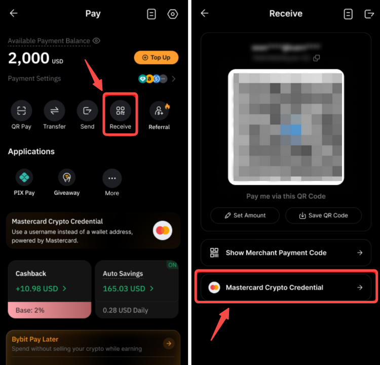 Passo 1: Na página do Bybit Pay, toque em Receber → Mastercard Crypto Credential, em seguida toque em Registrar.